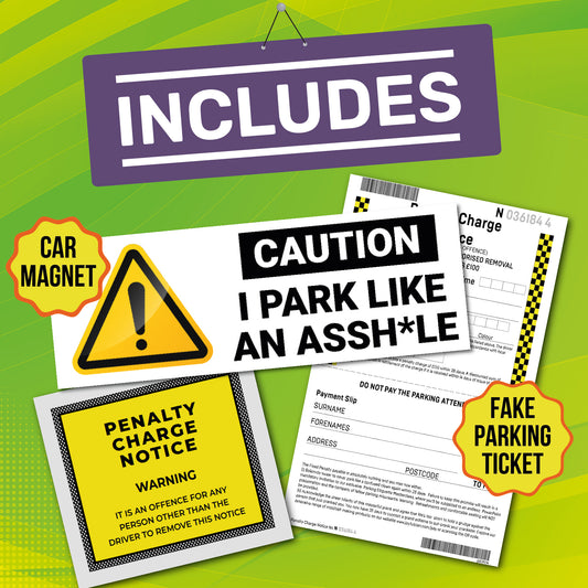 CAUTION I PARK LIKE AN ASSH*LE Car Magnet Bundle Prank - Includes Prank Parking Ticket